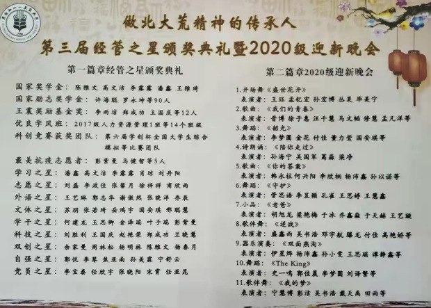 第三届“经管之星”颁奖典礼暨2020级迎新晚会在荡漾着的美妙歌声中圆满落下帷幕,此次活动的成功举办充分展现了我院学子有情怀、有期盼、有理想、有实践的精神面貌,进一步推进了我院学风建设的发展、人才全面培养的进程,激励着我院学子勇敢地乘风破浪,谱写绚丽青春篇章,共铸经管荣光。