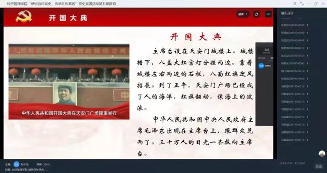 学生第一党支部党员刘子龙作为主讲人,从开国大典的背景、经过、意义三大方面来讲述,并播放影片《开国大典》精彩片段。同学们纷纷表示,历史是一面镜子,它照亮现实,也照亮未来。站在建党百年的关键节点上,我们广大青年党员要牢记初心使命,练就过硬本领,书写奋斗青春。