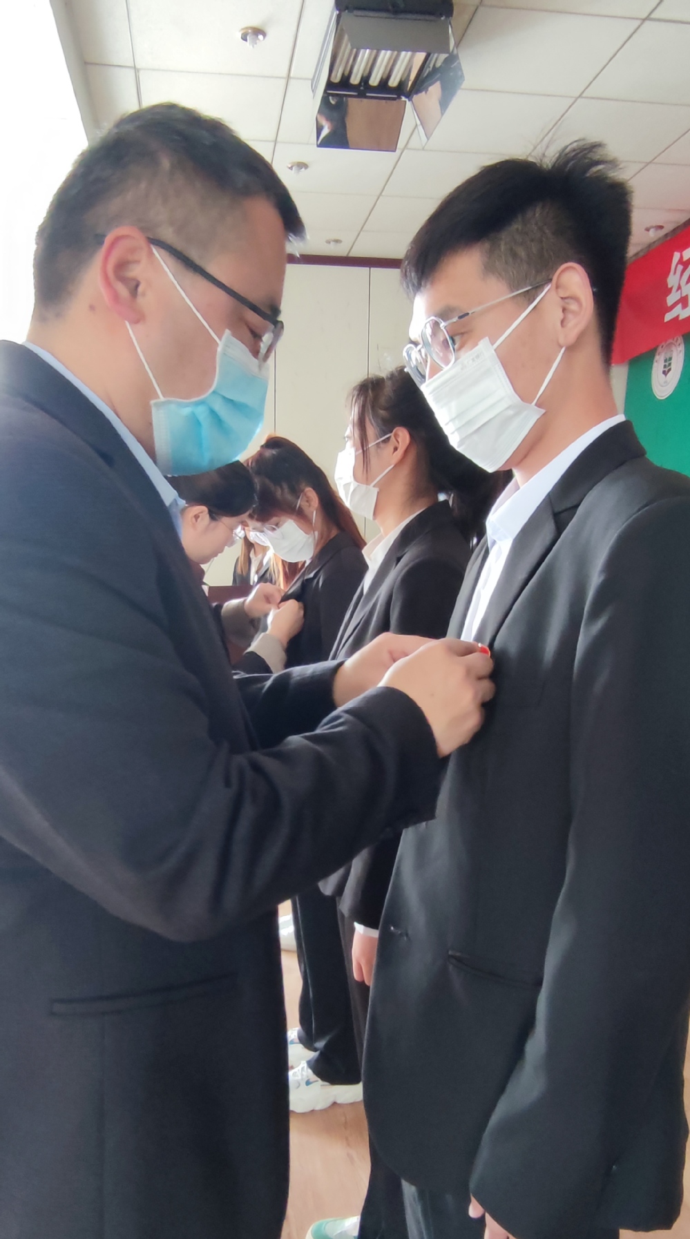 伴随着团旗的入场,入团仪式正式开始,学院党委副书记闯垒和2019级辅导员梁净为6名新团员佩戴团徽。