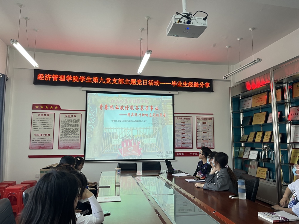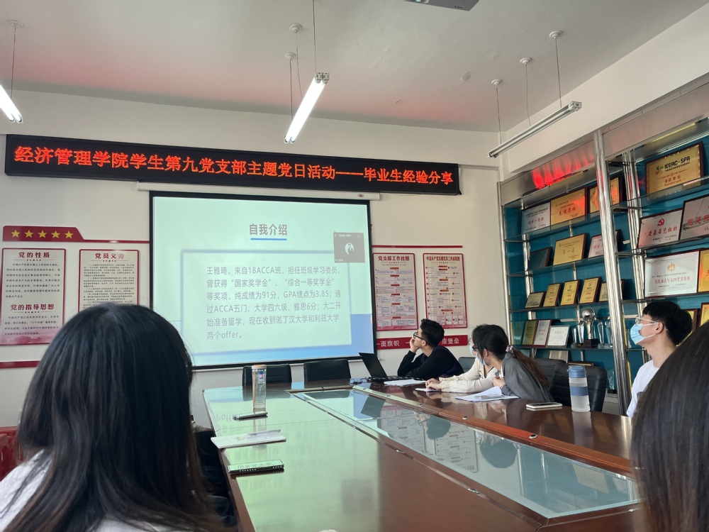 5月19日,我院学生第九党支部组织开展毕业生经验分享主题党日活动,本次活动采取线上线下相结合的方式,邀请留学申研学生代表王雅琦、研究生支教团成员高旺生、就业先锋陈楼作为主讲人,支部全体党员和积极分子参加。