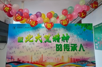 为了给新生留下关于大学的美好初印象,学院提前对公寓楼进行布置,五颜六色的气球,营造出温馨而热烈的迎新气氛。学院设置了“做北大荒精神的传承人”签名留念墙,同学们留下签名以及对大学生活的美好期盼,对学院产生了强烈的归属感;制作了带有学院特色的异形卡,同学们手持异形卡与家长、老师、同学在签名留念墙前合影留念,元气满满地打卡入校第一天。