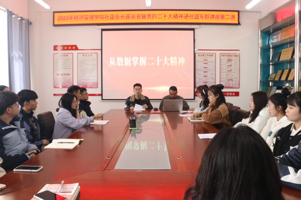 学院党委副书记闯垒结合社团发展实际,讲授以“从数据掌握党的二十大精神”为主题的党课,号召全体社团成员从党的二十大精神中汲取奋进力量,以党的二十大精神为指引,防范化解各类风险挑战,将党的二十大精神作为组织活动、指导活动的宝典,全面深入学习贯彻党的二十大精神。