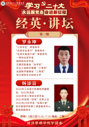 为学习贯彻党的二十大精神,加强学风建设,发挥榜样力量,引导学生以学为舟,奋楫笃行,4月22日,beat365在二教111室举办以“学习二十大,永远跟党走,奋进新征程”为主题的“经英”讲坛,邀请国家奖学金获得者、2019级物流管理专业学生罗永坤,“经管之星”代表、2021级会计学专业学生杨添富进行经验分享,200余名学生参加本次活动。