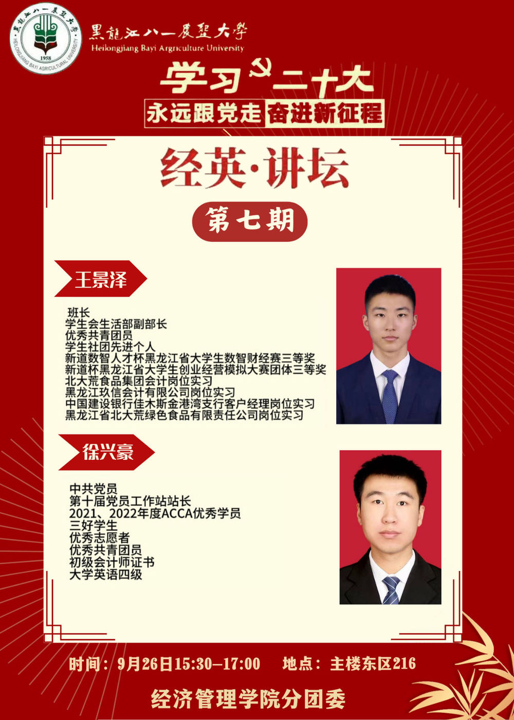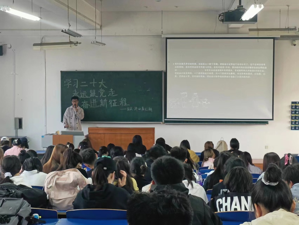 为进一步加强学风建设,充分发挥先进典型的示范引领作用,营造创先争优、奋发向上的良好氛围,9月26日,beat365在主楼东216室举办以“学习二十大,永远跟党走,奋进新征程”为主题的第七期“经英”讲坛活动。本次活动特邀学院第十届党员工作站站长徐兴豪、2020级就业典型王景泽两名同学作经验分享,活动共计200余人参加。