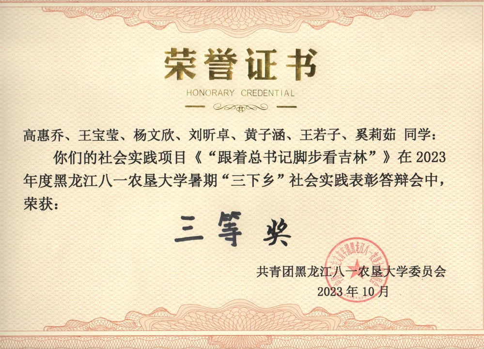 10月24日,2023年黑龙江八一农垦大学暑期社会实践答辩会圆满落幕,经管学子在激烈角逐中脱颖而出,2022级学生任雨航荣获“社会实践先进个人一等奖”、“青春践于行,脚步遍吉林”实践团荣获“社会实践优秀团队三等奖”。